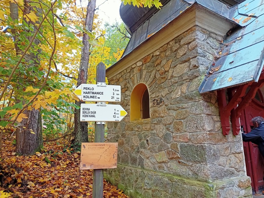 po Z zn na rozc. Rovina a dále po Ž zn přes Karlov a Peklo na NS, přes silnici na M zn a do Hartmanic.